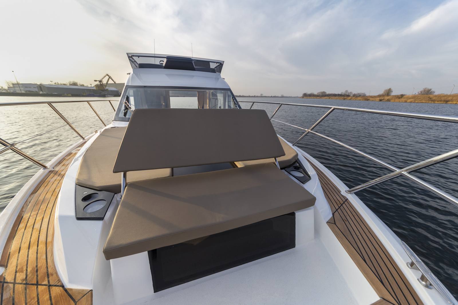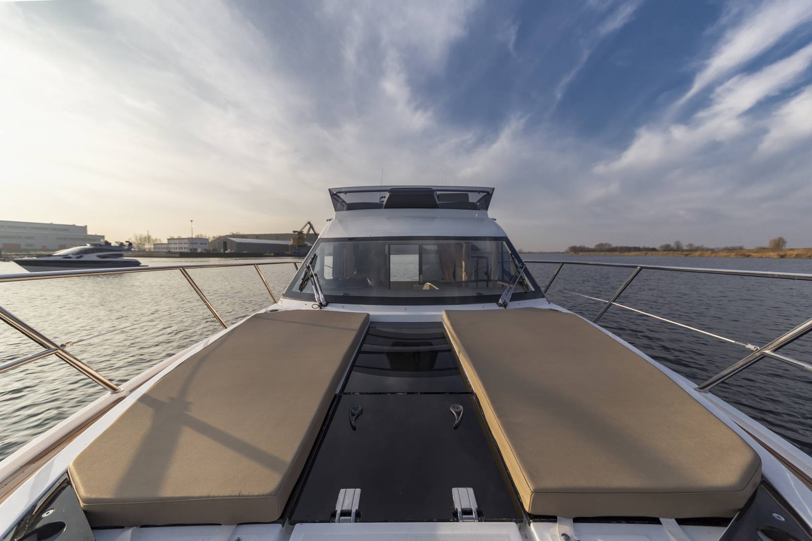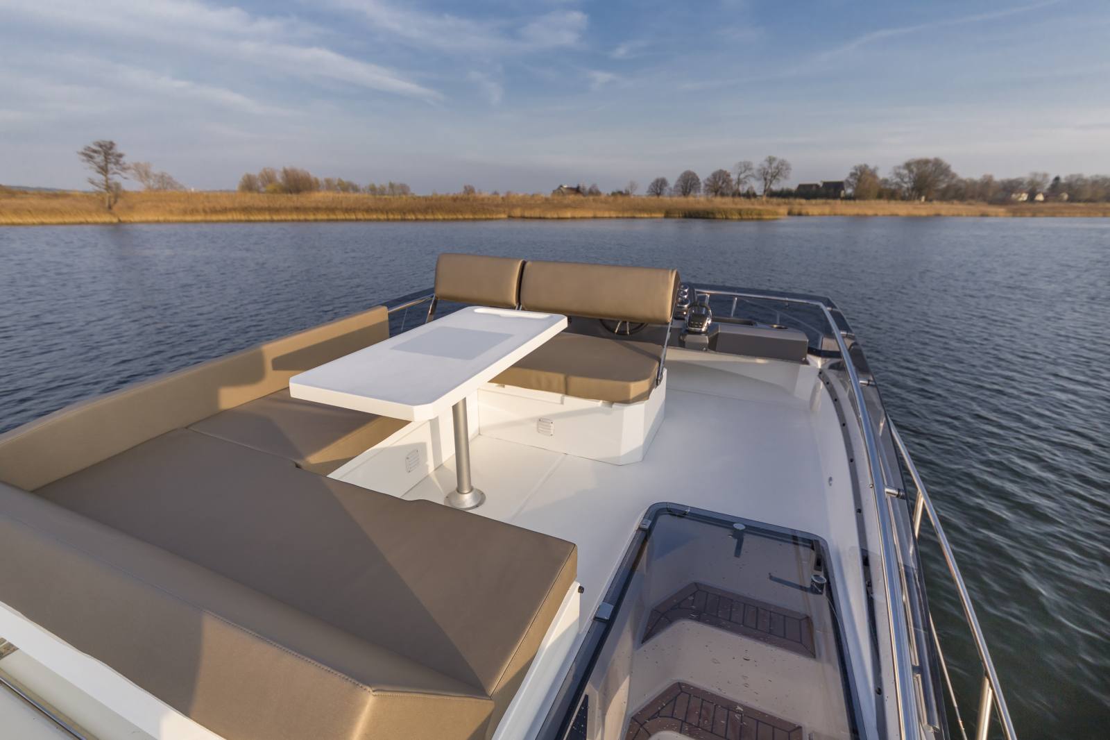 Up top, a double driver’s seat and a leisure area await the guests, while the more adventurous ones might opt for the bow sundecks or the innovative front seat for a thrilling ride. Inside, a large comfortable seating area faces the well-equipped galley, with the helm station moved forward. The driver is sure to appreciate the starboard sliding doors that allow for easy access to the bow during mooring.