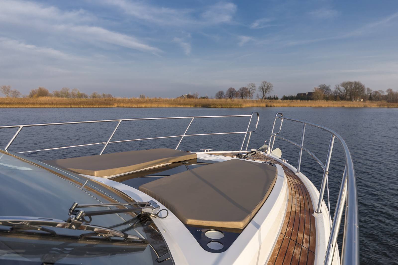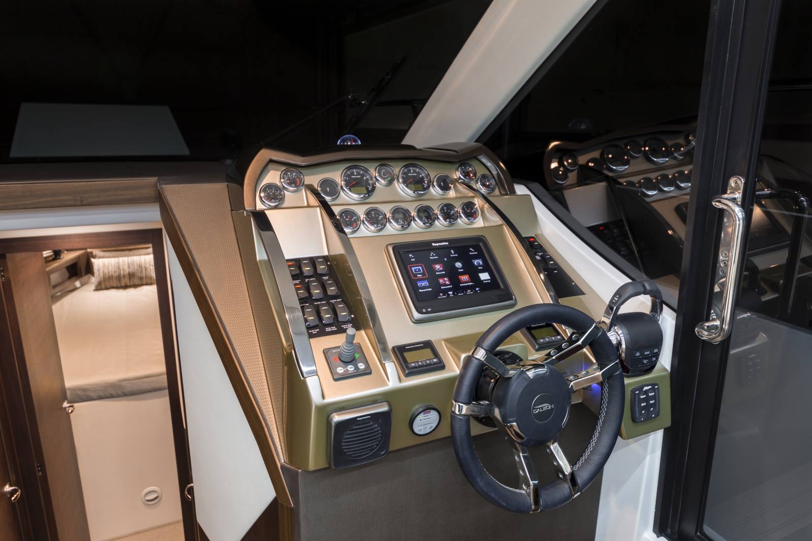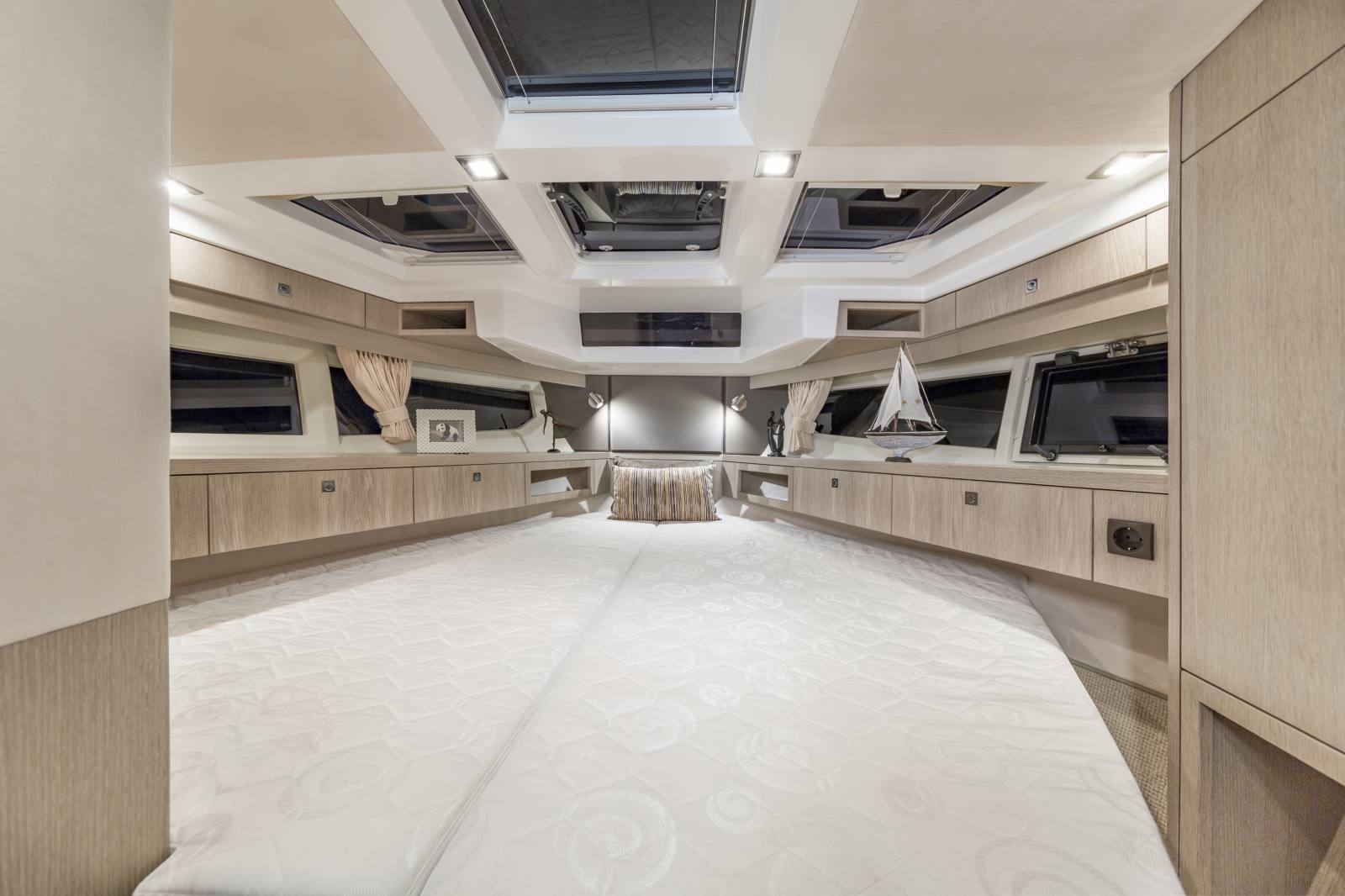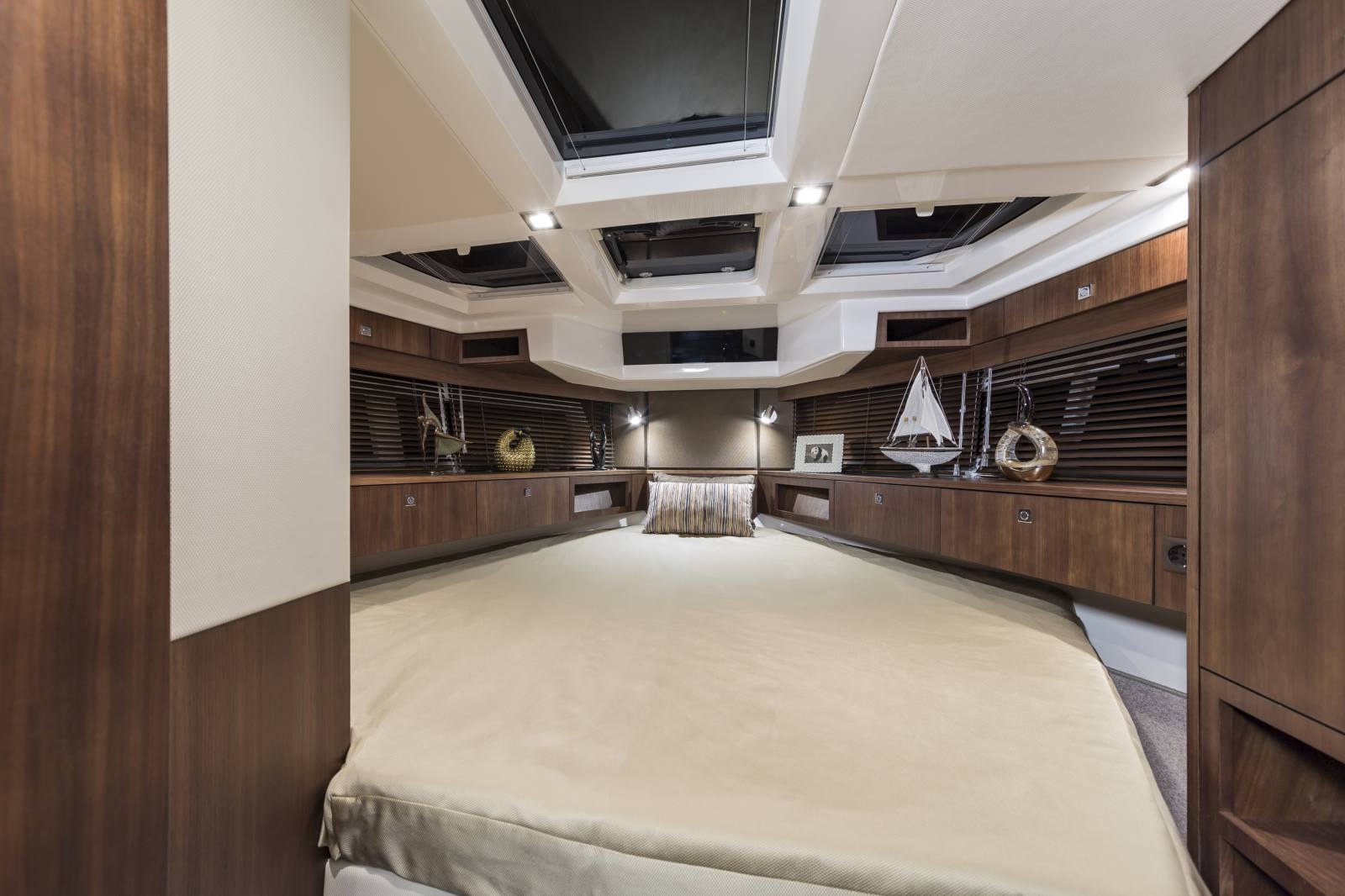 Up top, a double driver’s seat and a leisure area await the guests, while the more adventurous ones might opt for the bow sundecks or the innovative front seat for a thrilling ride. Inside, a large comfortable seating area faces the well-equipped galley, with the helm station moved forward. The driver is sure to appreciate the starboard sliding doors that allow for easy access to the bow during mooring.