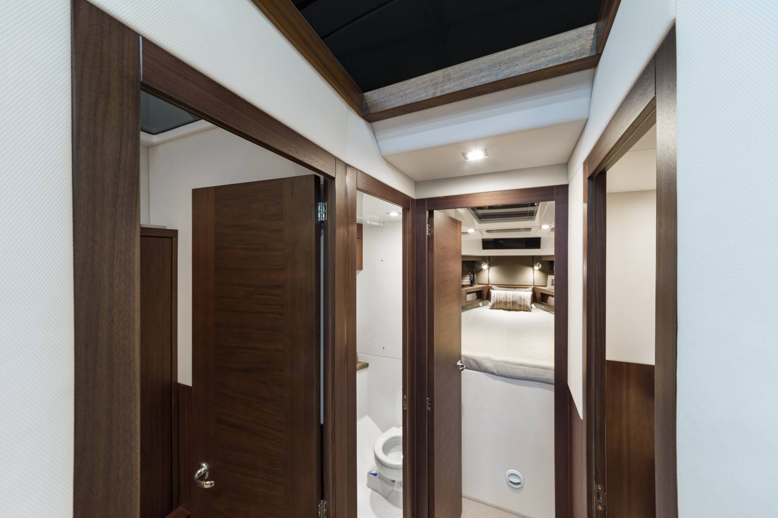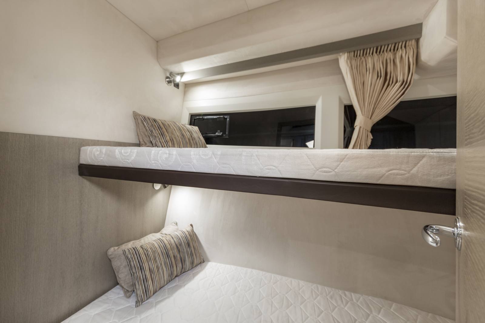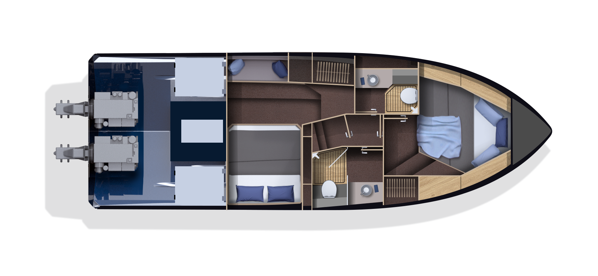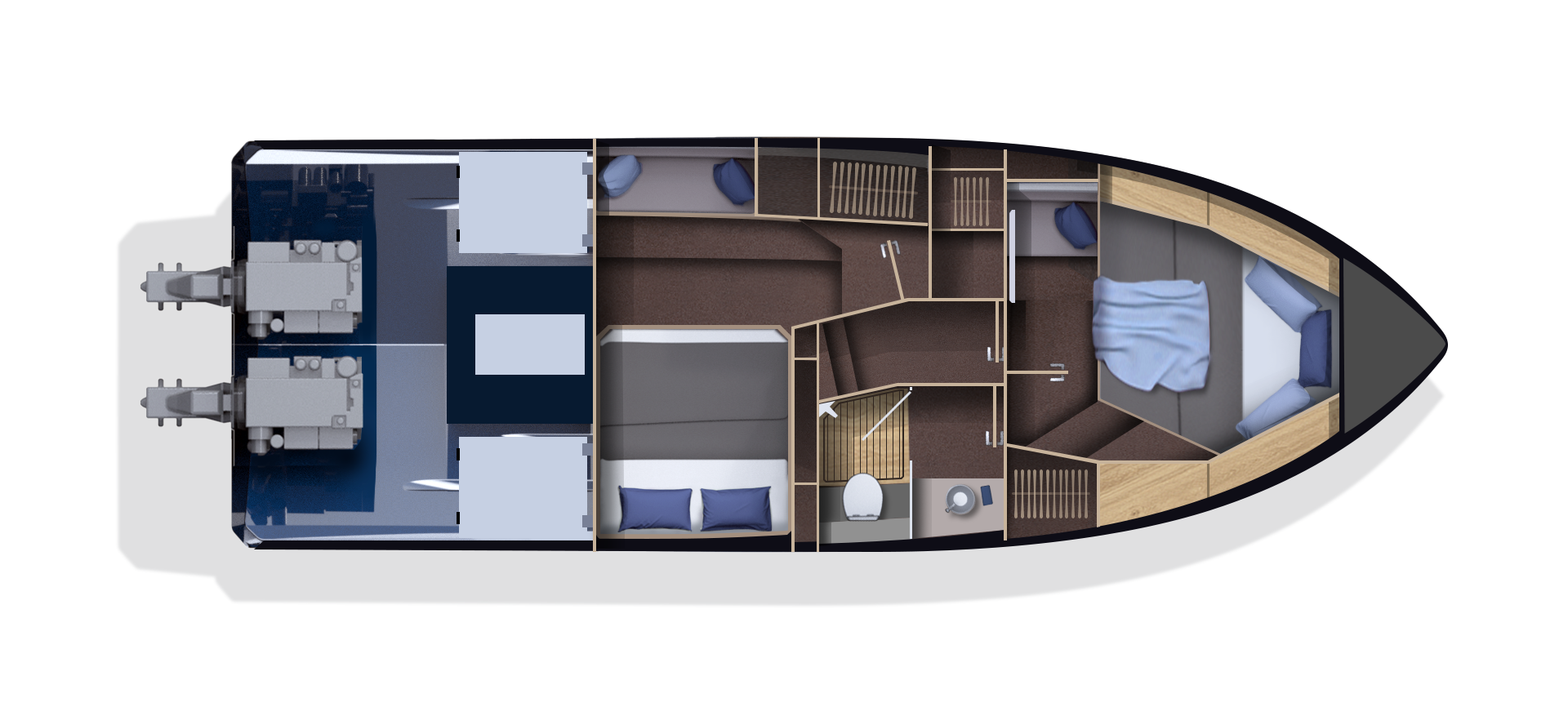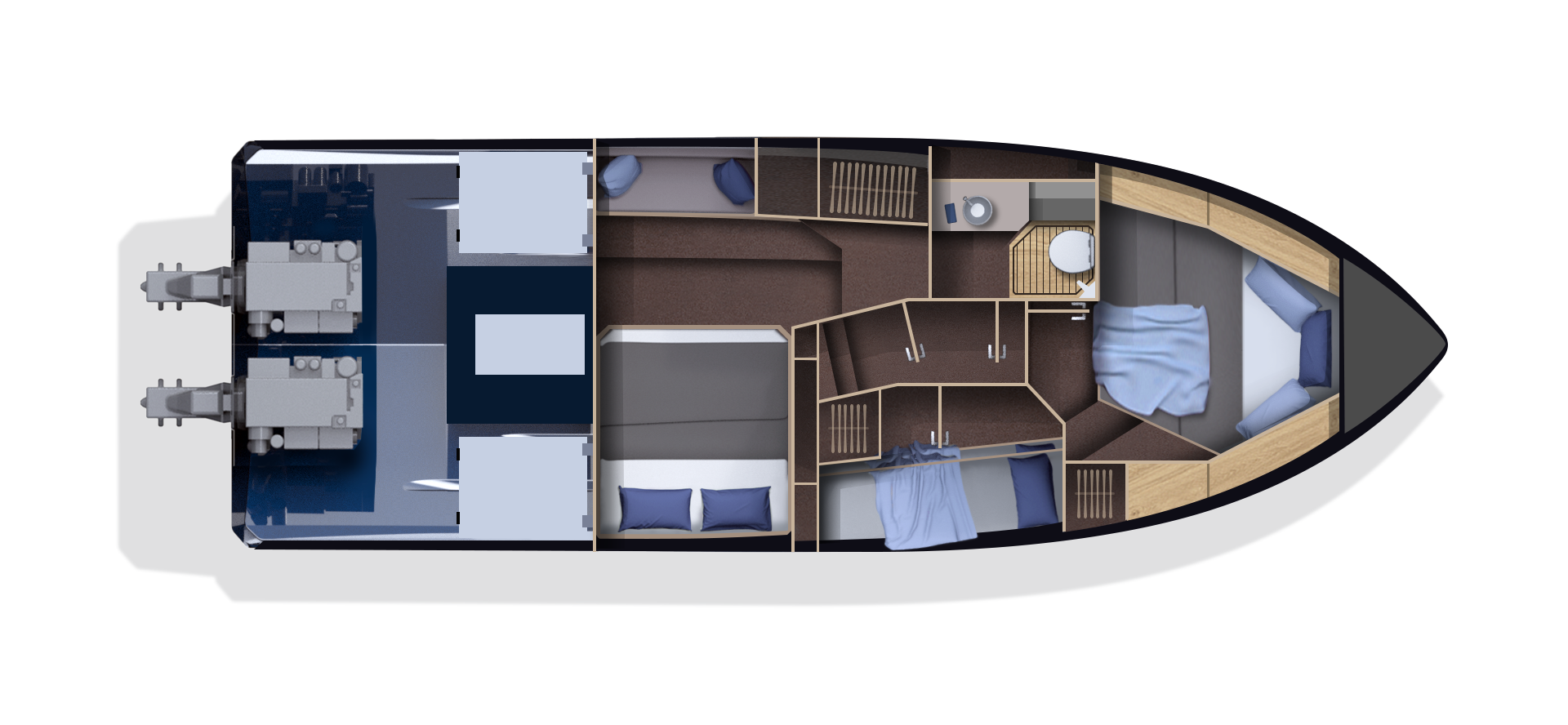 Find an incredible three cabin layout down below, complete with a shower fitted bathroom. Bunk beds in the guest cabin boost the number of berths down below to six, perfect for large families. All cabins offer standing height and extra storage that comes handy during longer cruises.