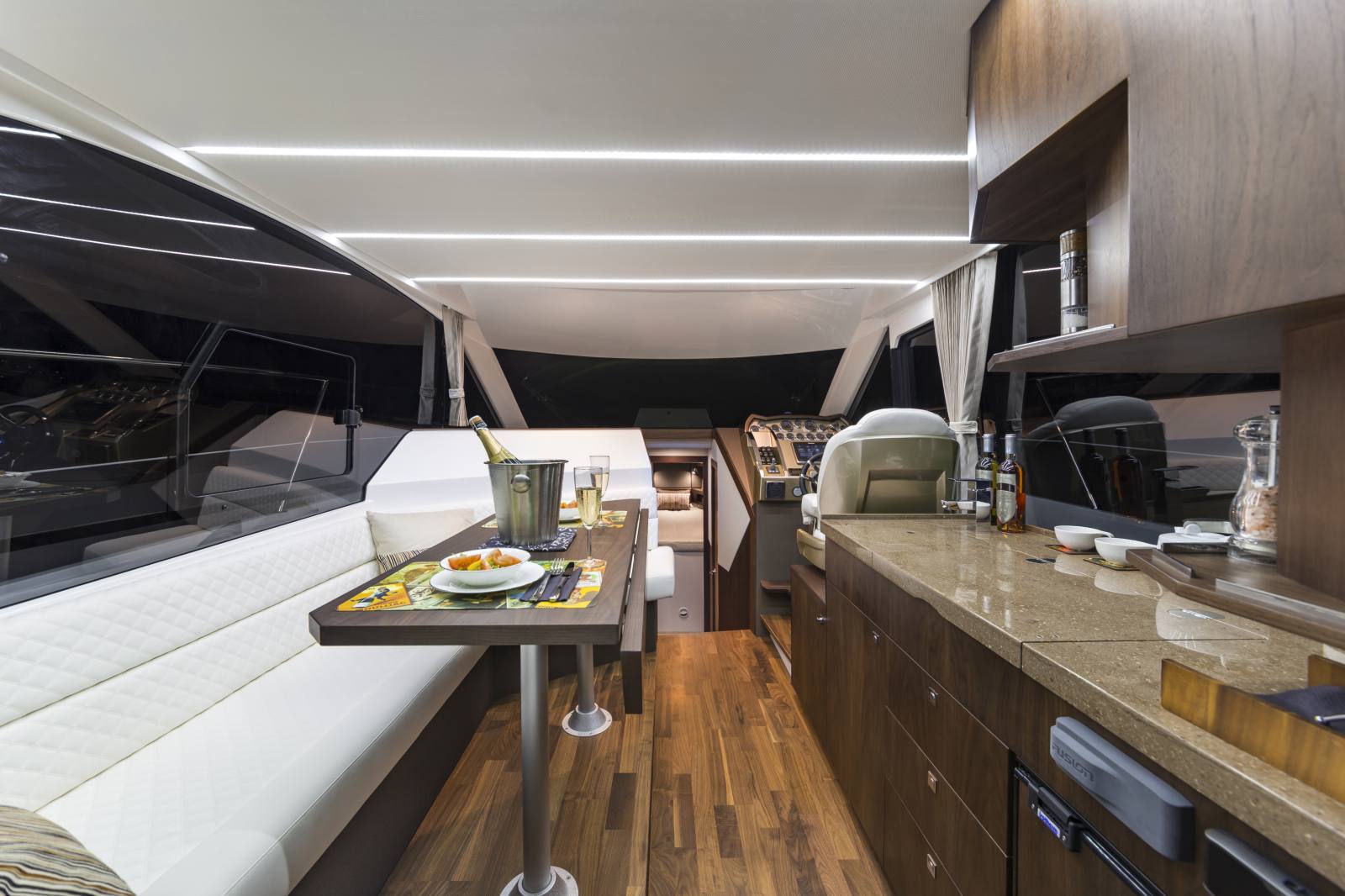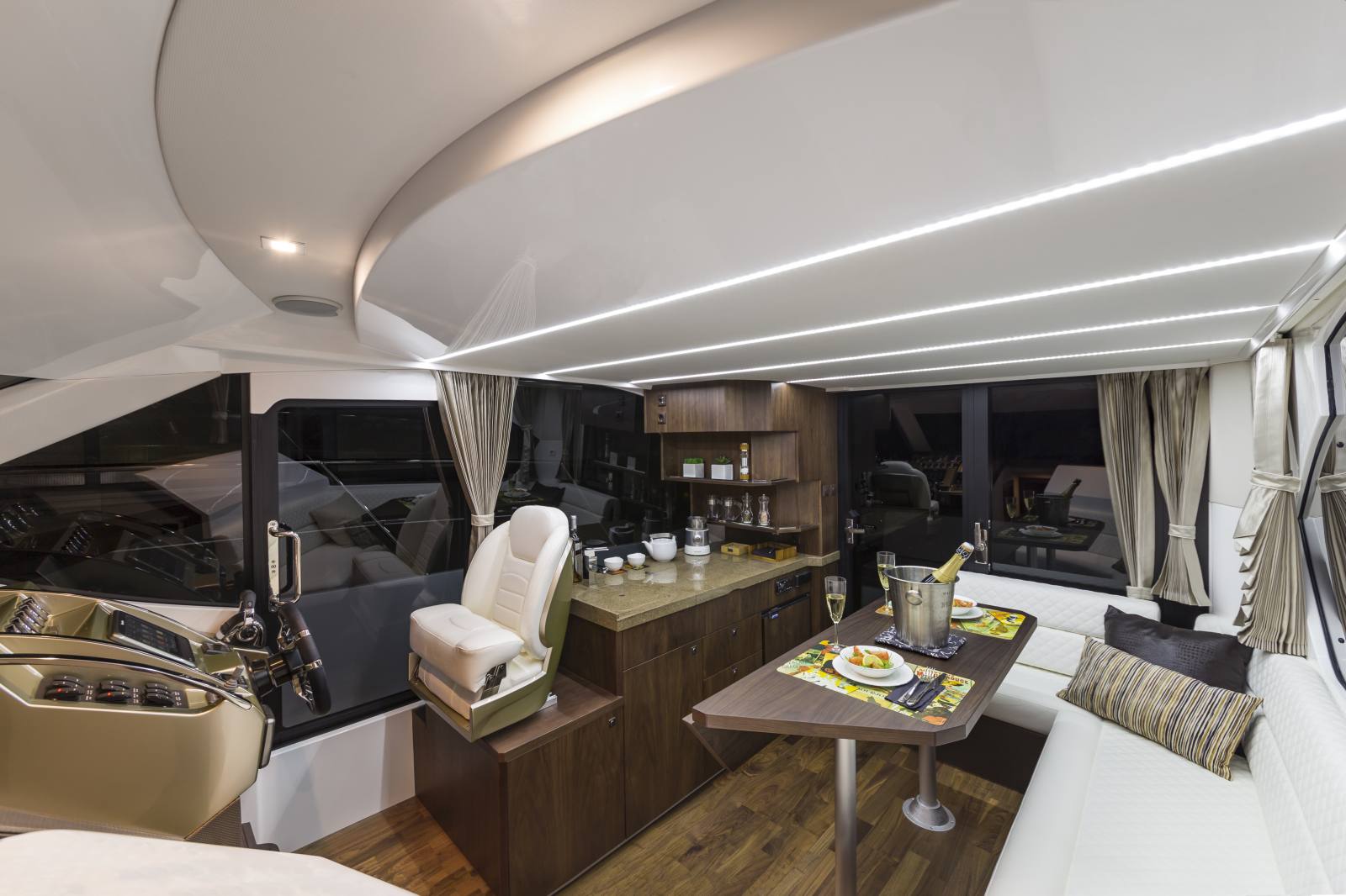 The cockpit area is fitted with an L-shaped sofa with a drop down backrest and wide steps that lead to the flybridge. Move the glass doors out of the way, flip the saloon seat to face the aft and create an even larger area for activities.